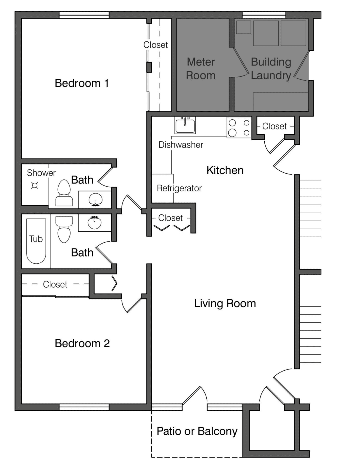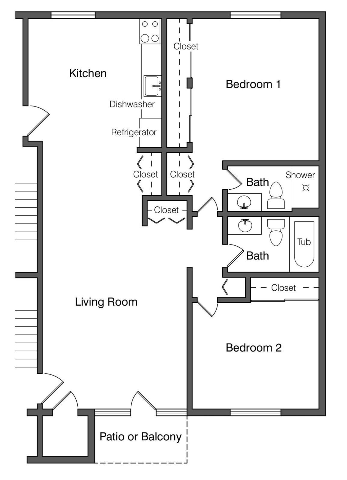 Our spacious two-bedroom units have a number of amenities such as heating, central air, two bathrooms, horizontal blinds, an on-site playground, and private patios or balconies.